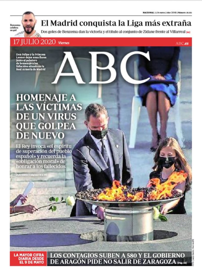 ABC: "Homenaje a las víctimas de un virus que golpea de nuevo. El Rey invoca "el espíritu de superación del pueblo español" y recuerda la "obligación moral" de honrar a los fallecidos. La mayor cifra diaria desde el 9 de mayo: Los contagios suben a 580 y el Gobierno de Aragón pide no salir de Zaragoza"; "El Madrid conquista la Liga más extraña".