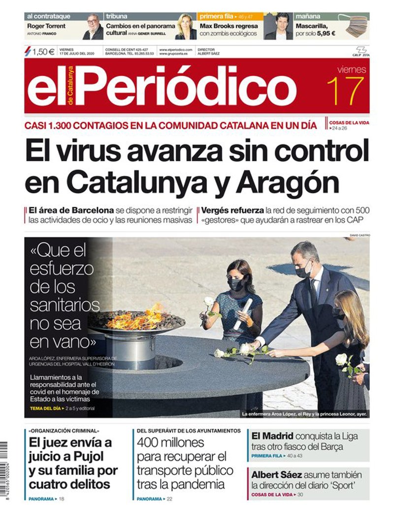 EL PERIÓDICO: "El virus avanza sin control en Catalunya y Aragón"; ""Que el esfuerzo de los sanitarios no sea en vano". Llamamiento a la responsabilidad ante el covid en el homenaje de Estado a las víctimas"; "El juez envía a Pujol y su familia por cuatro delitos"; "400 millones para recuperar el transporte público tras la pandemia"; "El Madrid conquista la Liga tras otro fiasco del Barça"; "Albert Sáez asume también la dirección del diario 'Sport'".