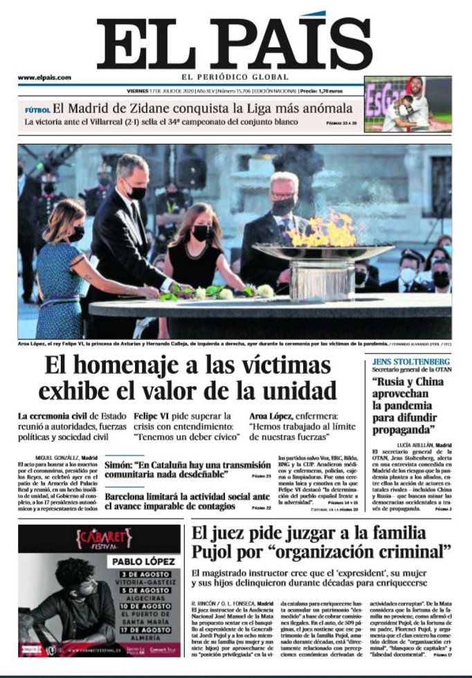EL PAÍS: "El homenaje a las víctimas exhibe el valor de la unidad. Simón: "En Cataluña hay una transmisión comunitaria nada desdeñable". Barcelona limitará la actividad social ante el avance imparable de contagios"; "El juez pide juzgar a la familia Pujol por "organización criminal""; "Jens Stoltenberg, secretario general de la OTAN: "Rusia y China aprovechan la pandemia para difundir propaganda"".