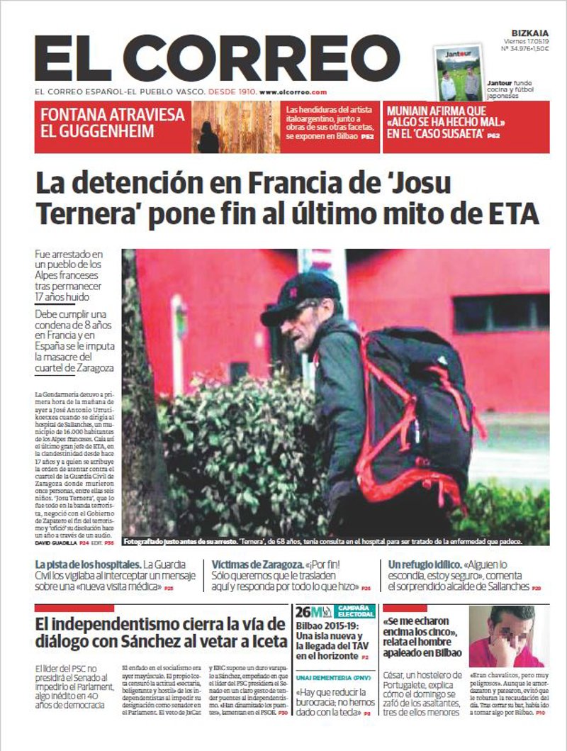 EL CORREO: "La detención en Francia de 'Josu Ternera' pone fin al último mito de ETA"; "El independentismo cierra la vía de diálogo con Sánchez al vetar a Iceta"; ""Se me echaron encima los cinco", relata el hombre apaleado en Bilbao".