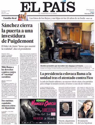 EL PAÍS: "Sánchez cierra la puerta a una investidura de Puigdemont"; "La presidencia eslovaca llama a la unidad tras el atentado contra Fico"; "Milei llama a las derechas a unirse contra el "enemigo" socialista"; "Tres turistas españoles mueren a tiros en Afganistán".
