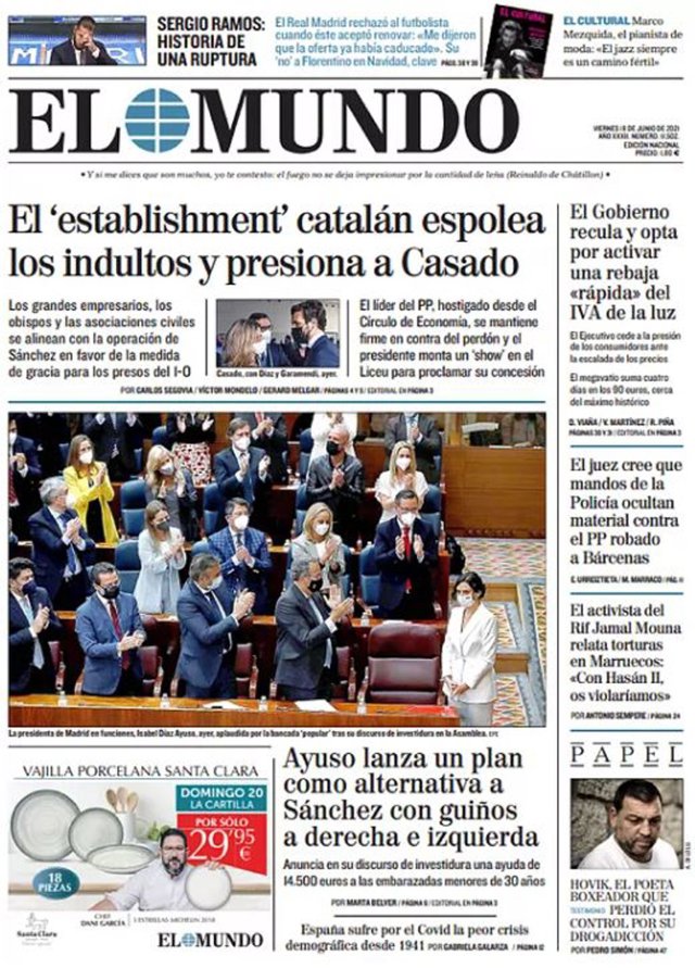 EL MUNDO: "El 'establishment' catalán espolea los indultos y presiona a Casado"; "El Gobierno recula y opta por activar una rebaja 'rápida' del IVA de la luz"; "El juez cree que mandos de la Policía ocultan material contra el PP robado a Bárcenas"; "Ayuso lanza un plan como alternativa a Sánchez con guiños a derecha e izquierda"; "El activista del Rif Jamal Mouna relata torturas en Marruecos: 'Con Hasán II, os violaríamos'".