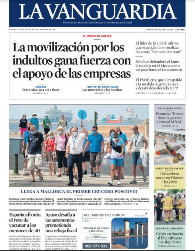 LA VANGUARDIA: "La movilización por los indultos gana fuerza con el apoyo de las empresas"; "España afronta el reto de vacunar a los menores de 40"; "Ayuso desafía a las autonomías prometiendo una rebaja fiscal"; "Llega a Mallorca el primer crucero poscovid".