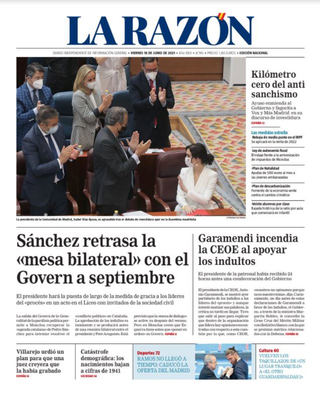 LA RAZÓN: "Sánchez retrasa la "mesa bilateral" con el Govern a septiembre"; "Garamendi incendia la CEOE al apoyar los indultos"; "Kilómetro cero del anti sanchismo"; "Villarejo urdió un plan para que una juez creyera que la había grabado"; "Catástrofe demográfica: los nacimientos bajan a cifras de 1941"; "Ramos no llegó a tiempo: caducó la oferta del Madrid".