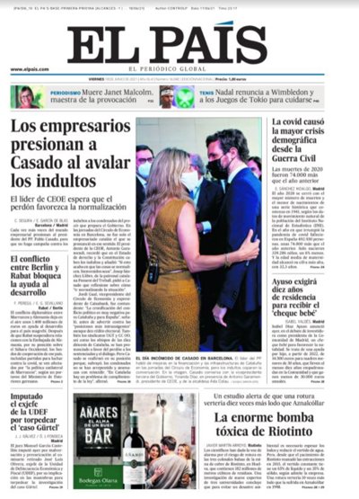 EL PAÍS: "Los empresarios presionan a Casado al avalar los indultos"; "La covid causó la mayor crisis demográfica desde la Guerra Civil"; "El conflicto entre Berlín y Rabat bloquea la ayuda al desarrollo"; "Imputado el exjefe de la UDEF por torpedear el 'caso Gürtel'"; "Ayuso exigirá diez años de residencia para recibir el 'cheque bebé'"; "La enorme bomba tóxica de Riotinto".