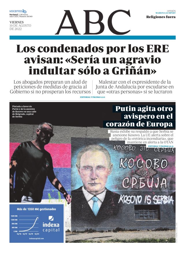 ABC: "Los condenados por los ERE avisan: "Sería un agravio indultar solo a Griñán"; "Putin agita otro avispero en el corazón de Europa".