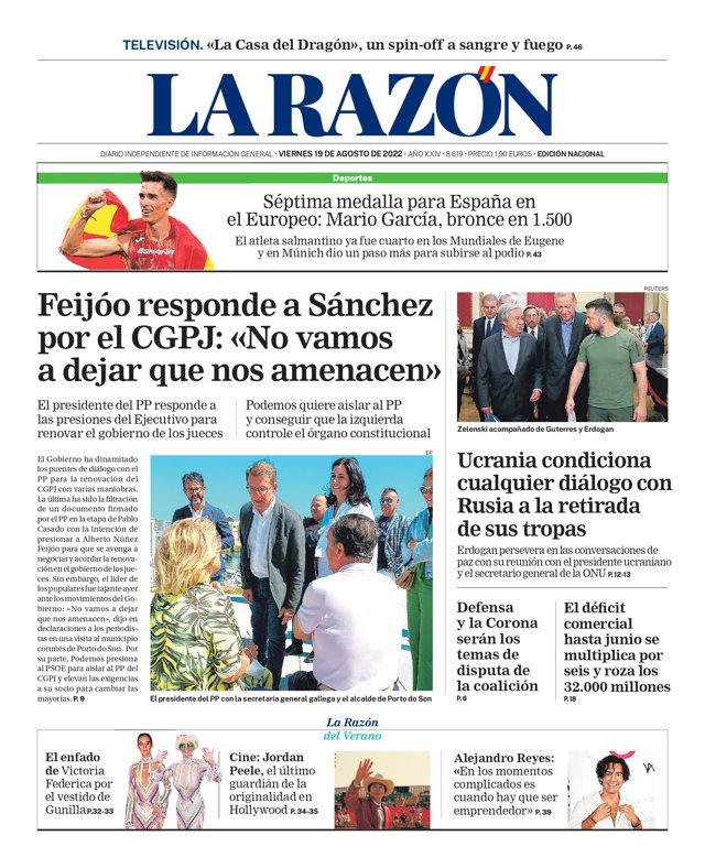 LA RAZÓN: "Feijóo responde a Sánchez por el CGPJ: No vamos a dejar que nos amenacen"; "Ucrania condiciona cualquier diálogo con Rusia a la retirada de sus tropas"; "Defensa y la Corona serán los temas de disputa de la coalición"; "El déficit comercial hasta junio se multiplica por seis y roza los 32.000 millones".