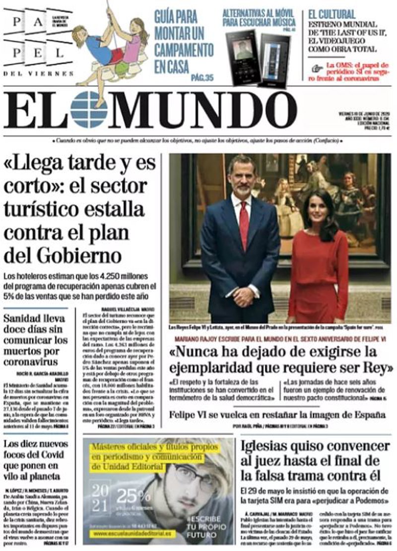 EL MUNDO: ""Llega tarde y es corto": el sector turístico estalla contra el plan del Gobierno"; "Sanidad lleva doce días sin comunicar los muertos por coronavirus"; "Los diez nuevos focos del Covid que ponen en vilo al planeta"; "Mariano Rajoy escribe para 'El Mundo' en el sexto aniversario de Felipe VI: "Nunca ha dejado de exigirse la ejemplaridad que requiere ser Rey""; "Felipe VI se vuelca en restañar la imagen de España"; "Iglesias quiso convencer al juez hasta el final de la falsa trama contra él".