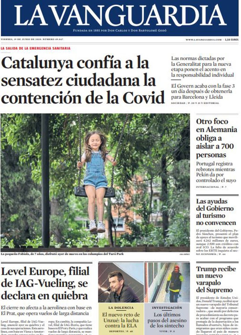 LA VANGUARDIA: "Catalunya confía a la sensatez ciudadana la contención de la Covid"; "Level Europe, filial de IAG-Vueling, se declara en quiebra"; "Otro foco en Alemania obliga a aislar a 700 personas"; "Las ayudas del Gobierno alturismo no convencen"; "Trump recibe un nuevo varapalo del Supremo".