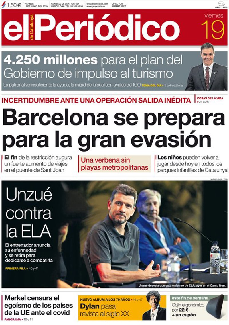 EL PERIÓDICO: "4.250 millones para el plan del Gobierno de impulso al turismo"; "Barcelona se prepara para la gran evasión"; "Unzúe contra la ELA. El entrenador anuncia su enfermedad y se retira para dedicarse a combatirla"; "Merkel censura el egoísmo de los países de la UE ante el covid"; "Dylan pasa revista al siglo XX".