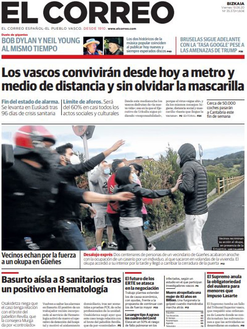 EL CORREO: "Los vascos convivirán desde hoy a metro y medio de distancia y sin olvidar la mascarilla"; "Basurto aísla a 8 sanitarios tras un positivo en Hematología"; "El Supremo anula la obligatoriedad del euskera para menores que impuso Lasarte"; "El futuro de los ERTE se atasca en la negociación"; "La sangre tipo A agrava los cuadros del Covid"; "Muere atropellada una mujer de 83 años en Bilbao".