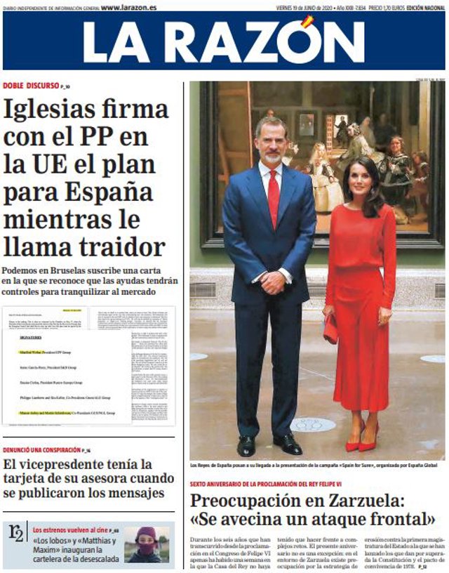 LA RAZÓN: "Iglesias firma con el PP en la UE el plan para España mientras le llama traidor"; "El vicepresdente tenía la tarjeta de su asesora cuando se publicaron los mensajes"; "Preocupación en Zarzuela: "Se avecina un ataque frontal"".