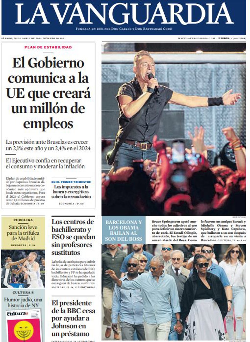 LA VANGUARDIA: "El Gobierno comunica a la UE que creará un millón de empleos"; "Los centros de bachillerato y ESO se quedan sin profesores sustitutos"; "El presidente de la BBC cesa por ayudar a Johnson en un préstamo".