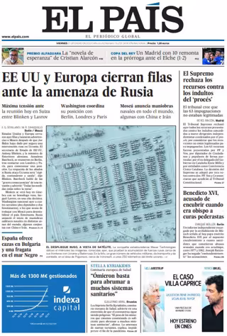 EL PAÍS: "EEUU y Europa cierran filas ante la amenaza de Rusia"; "España ofrece cazas en Bulgaria y una fragata en el mar Negro"; "Stella Kyriakides, comisaria europea de Salud: "Ómicron basta para abrumar a muchos sistemas sanitarios""; "El Supremo rechaza los recursos contra los indultos del 'procés'"; "Benedicto XVI, acusado de encubrir cuando era obispo a curas pederastas".