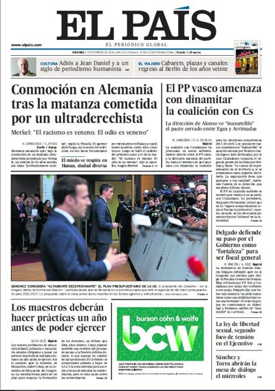EL PAÍS: "Conmoción en Alemania tras la matanza cometida por un utraderechista. El miedo se respira en Hanau, ciudad diversa"; "El PP vasco amenaza con dinamitar la coalición con Cs"; "Sánchez considera "altamente decepcionante" el plan presupuestario de la UE"; "Los maestros deberán hacer prácticas un año antes de poder ejercer"; "Delgado defiende su paso por el Gobierno como una "fortaleza" para ser fiscal general"; "La ley de libertad sexual, segundo foco de tensión en el Ejecutivo"; "Sánchez y Torra abrirán la mesa de diálogo el miércoles".