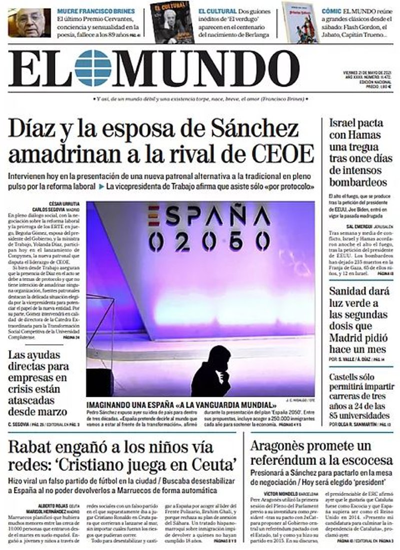 EL MUNDO: "Díaz y la esposa de Sánchez amadrinan a la rival de CEOE"; "Las ayudas directas para empresas en crisis están atascadas desde marzo"; "Rabat engañó a los niños vía redes: 'Cristiano juega en Ceuta'; "Israel pacta con Hamas una tregua tras once días de intensos bombardeos"; "Sanidad dará luz verde a las segundas dosis que Madrid pidió hace un mes"; "Castells sólo permitirá impartir carreras de tres años a 24 de las 85 universidades"; "Aragonès promete un referéndum a la escocesa".