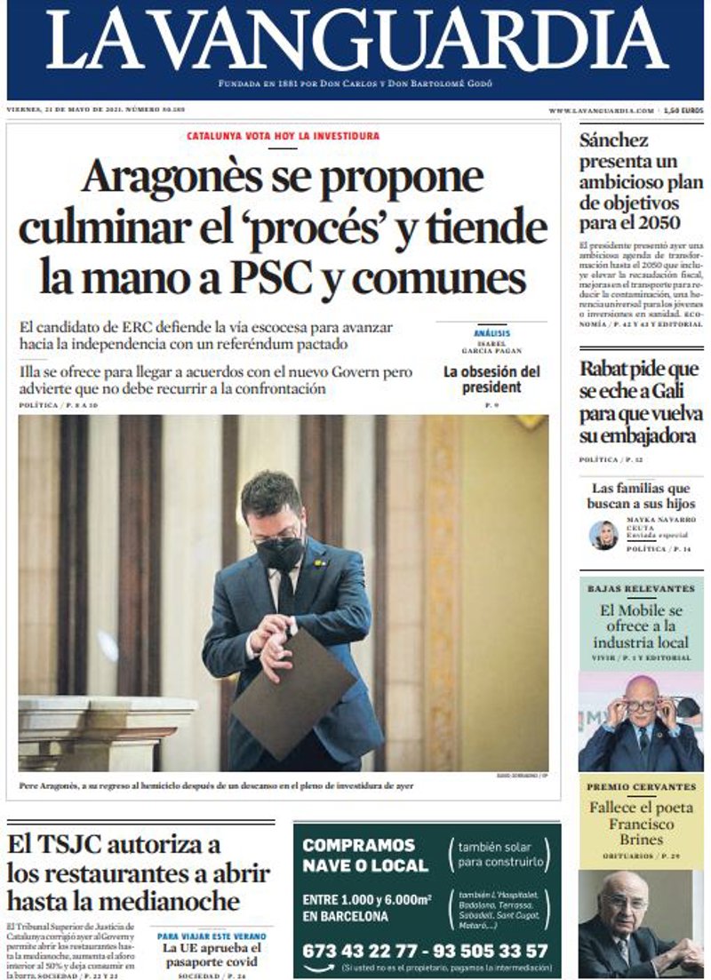 LA VANGUARDIA: "Aragonès se propone culminar el 'procés' y tiende la mano a PSC y comunes"; "El TSJC autoriza a los restaurantes a abrir hasta la medianoche"; "Sánchez presenta un ambicioso plan de objetivos para el 2050"; "Rabat pide que se eche a Gali para que vuelva su embajadora".