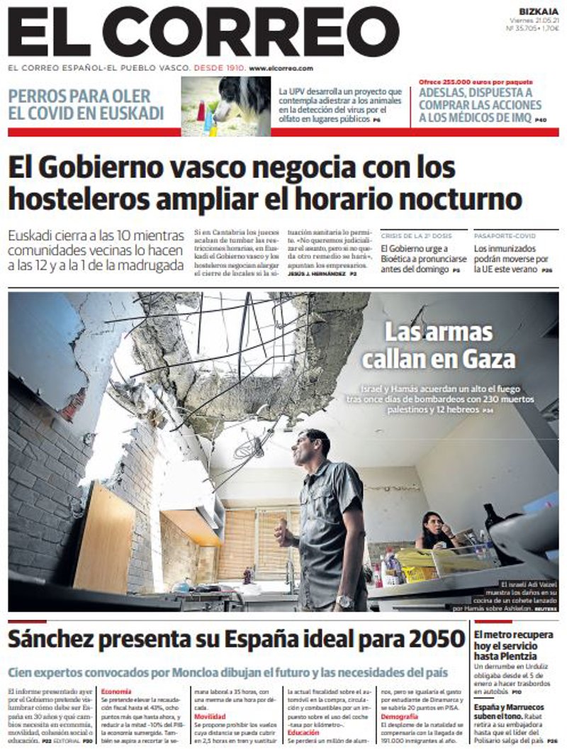 EL CORREO: "El Gobierno vasco negocia con los hosteleros ampliar el horario nocturno"; "Las armas callan en Gaza. Israel y Hamás acuerdan un alto el fuego tras once días de bombardeos con 230 muertos palestinos y 12 hebreos"; "Sánchez presenta su España ideal para 2050"; "El metro recupera hoy el servicio hasta Plentzia"; "España y Marruecos suben el tono".