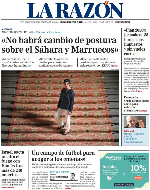 LA RAZÓN: "Arancha González Laya, ministra de Asuntos Exteriores: "No habrá cambio de postura sobre el Sáhara y Marruecos""; "Un campo de fútbol para acoger a los "menas". El Ejército despliega tiendas de campaña para los menores, mientras la Policía bate las calles para expulsar al resto"; "Israel pacta un alto el fuego con Hamás tras más de 240 muertos"; ""Plan 2050": jornada de 35 horas, más impuestos y sin vuelos cortos"; "Europa da luz verde al pasaporte covid para relanzar el turismo".