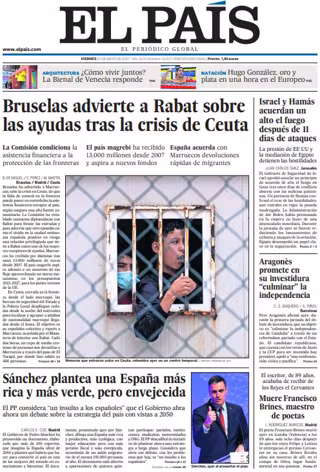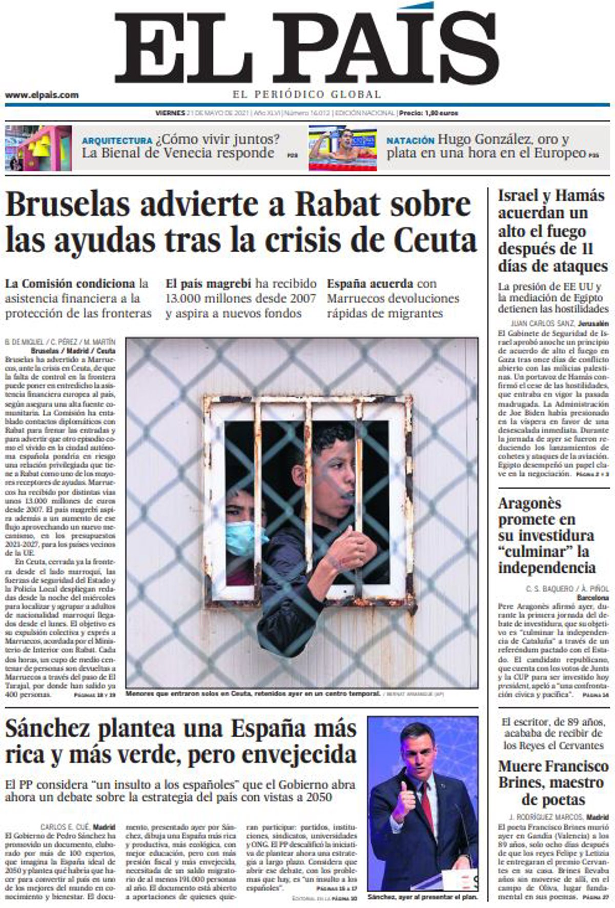 EL PAÍS: "Bruselas advierte a Rabat sobre las ayudas tras la crisis de Ceuta"; "Sánchez plantea una España más rica y más verde, pero envejecida"; "Israel y Hamás acuerdan un alto el fuego después de 11 días de ataques"; "Aragonès promete en su investidura "culminar" la independencia"; "Muere Francisco Brines, maestro de poetas".