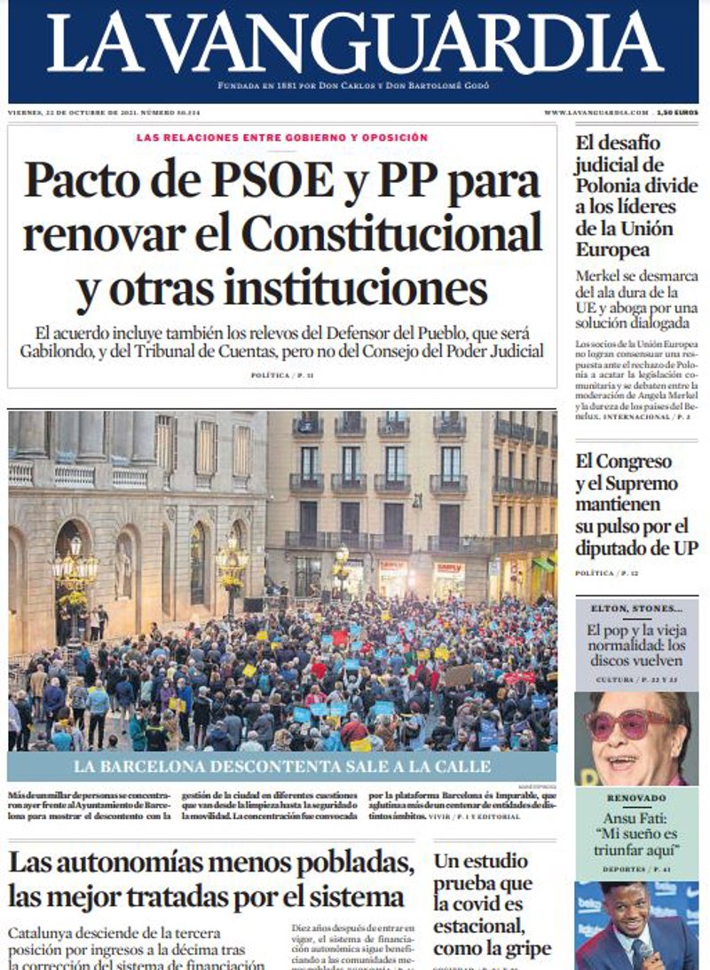EL MUNDO: "El Gobierno y el PP se reparten el TC con cuatro perfiles afines"; "Iberdrola ofrece una tregua a Sánchez si retira su decreto"; "Batet dilata la retirada del acta al diputada de Podemos y el PP le avisa de prevaricación"; "Ayuso quita las mascarillas en el patio pese a la oposición del Ejecutivo"; "Bruselas rebaja la tensión para evitar el choque con Polonia".