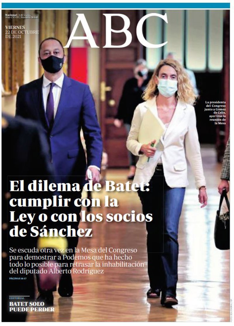 ABC: "El dilema de Batet: cumplir con la Ley o con los socios de Sánchez. Se escuda otra vez en la Mesa del Congreso para demostrar a Podemos que ha hecho todo lo posible para retrasar la inhabilitación del diputado Alberto Rodríguez".