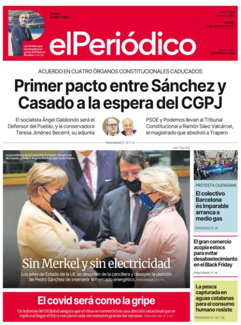 EL PERIÓDICO: "Primer pacto entre Sánchez y Casado a la espera del CGPJ"; "Sin Merkel y sin electricidad"; "El covid será como la gripe"; "El colectivo Barcelona és Imparable arranca a medio gas"; "El gran comercio acopia estocs para evitar desabastecimiento en el Black Friday"; "La pesca capturada en aguas catalanas para el consumo humano resiste".