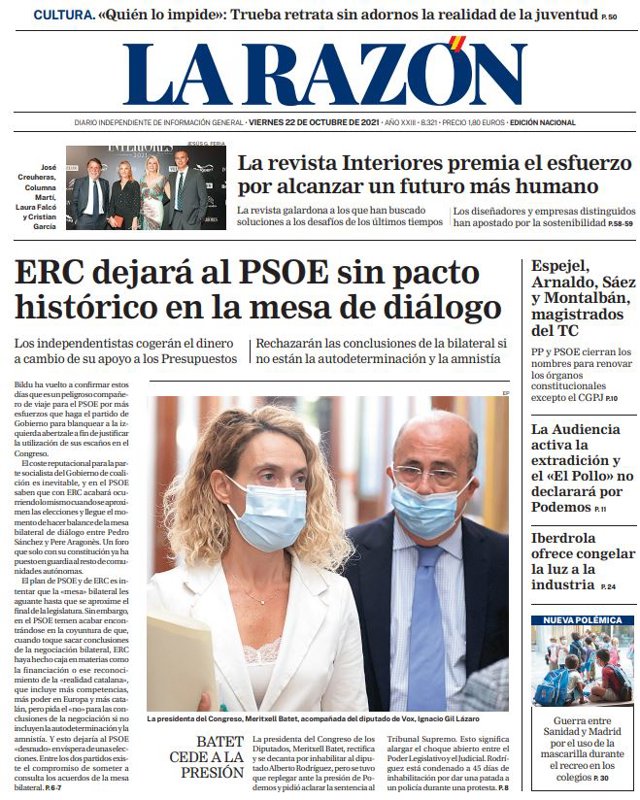 LA RAZÓN: "ERC dejará al PSOE sin pacto histórico en la mesa de diálogo"; "La revista Interiores premia el esfuerzo por alcanzar un futuro más humano"; "Espejel, Arnaldo, Sáez y Montalbán, magistrados del TC"; "La Audiencia activa la extradición y el "El Pollo" no declarará por Podemos"; "Iberdrola ofrece congelar la luz a la industria".