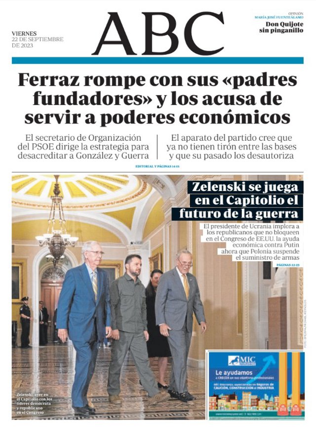 ABC: "Ferraz rompe con sus padres fundadores y los acusa de servir a poderes económicos"; "Zelenski se juega en el Capitolio el futuro de la guerra".