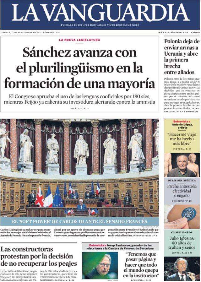 LA VANGUARDIA: "Sánchez avanza con el plurilingüismo en la formación de una mayoría"; "Polonia deja de enviar armas a Ucrania y abre la primera brecha entre aliados"; "El 'soft power' de Carlos III ante el Senado francés"; "Las constructoras protestan por la decisión de no recuperar los peajes".