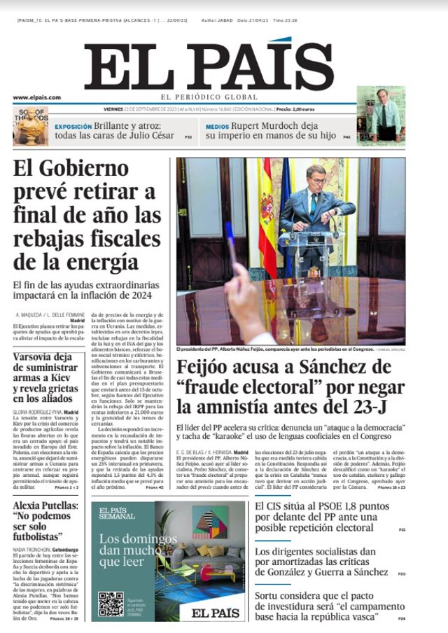 EL PAÍS: "El Gobierno prevé retirar a final de año las rebajas fiscales de la energía"; "Feijóo acusa a Sánchez de "fraude electoral" por negar la amnistía antes del 23-J"; "Varsovia deja