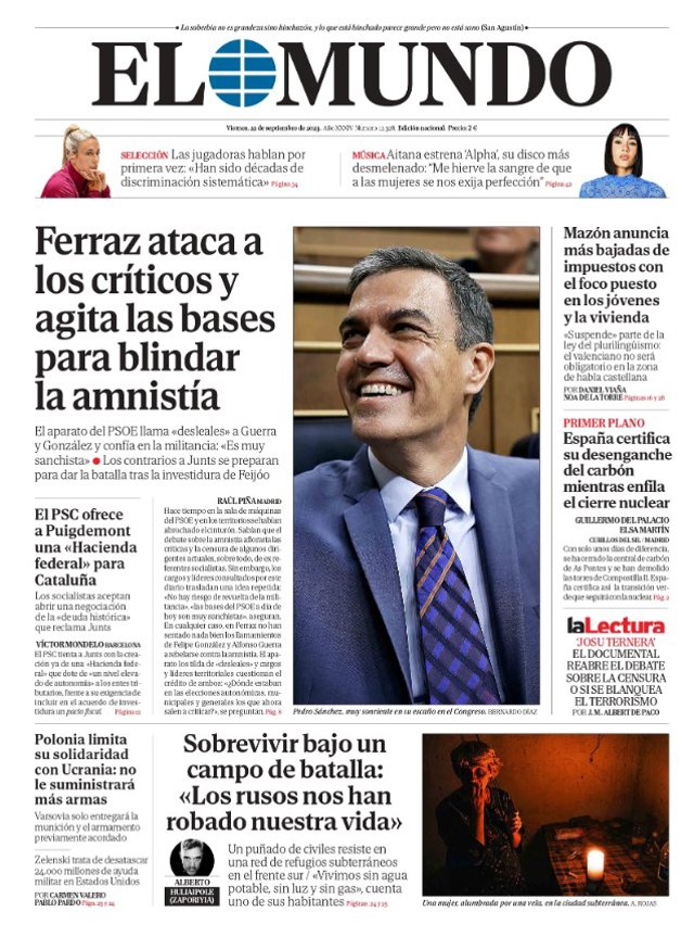 EL MUNDO: "Ferraz ataca a los críticos y agita las bases para blindar la amnistía"; "Mazón anuncia más bajadas de impuestos con el foco puesto en los jóvenes y la vivienda"; "El PSC ofrece a Puigdemont una 'Hacienda federal' para Cataluña"; "Polonia limita su solidaridad con Ucrania: no le suministrará más armas"; "Sobrevivir bajo un campo de batalla: Los rusos nos han robado nuestra vida".