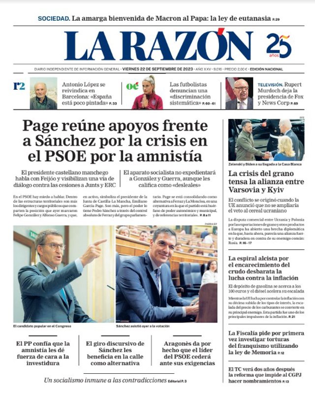 LA RAZÓN: "Page reúne apoyos frente a Sánchez por la crisis en el PSOE por la amnistía"; "La crisis del grano tensa la alianza entre Varsovia y Kyiv"; "La espiral alcista por el encarecimiento del crudo desbarata la lucha contra la inflación"; "La Fiscalía pide por primera vez investigar torturas del franquismo utilizando la ley de Memoria"; "El TC verá dos años después la reforma que impide al CGPJ hacer nombramientos".