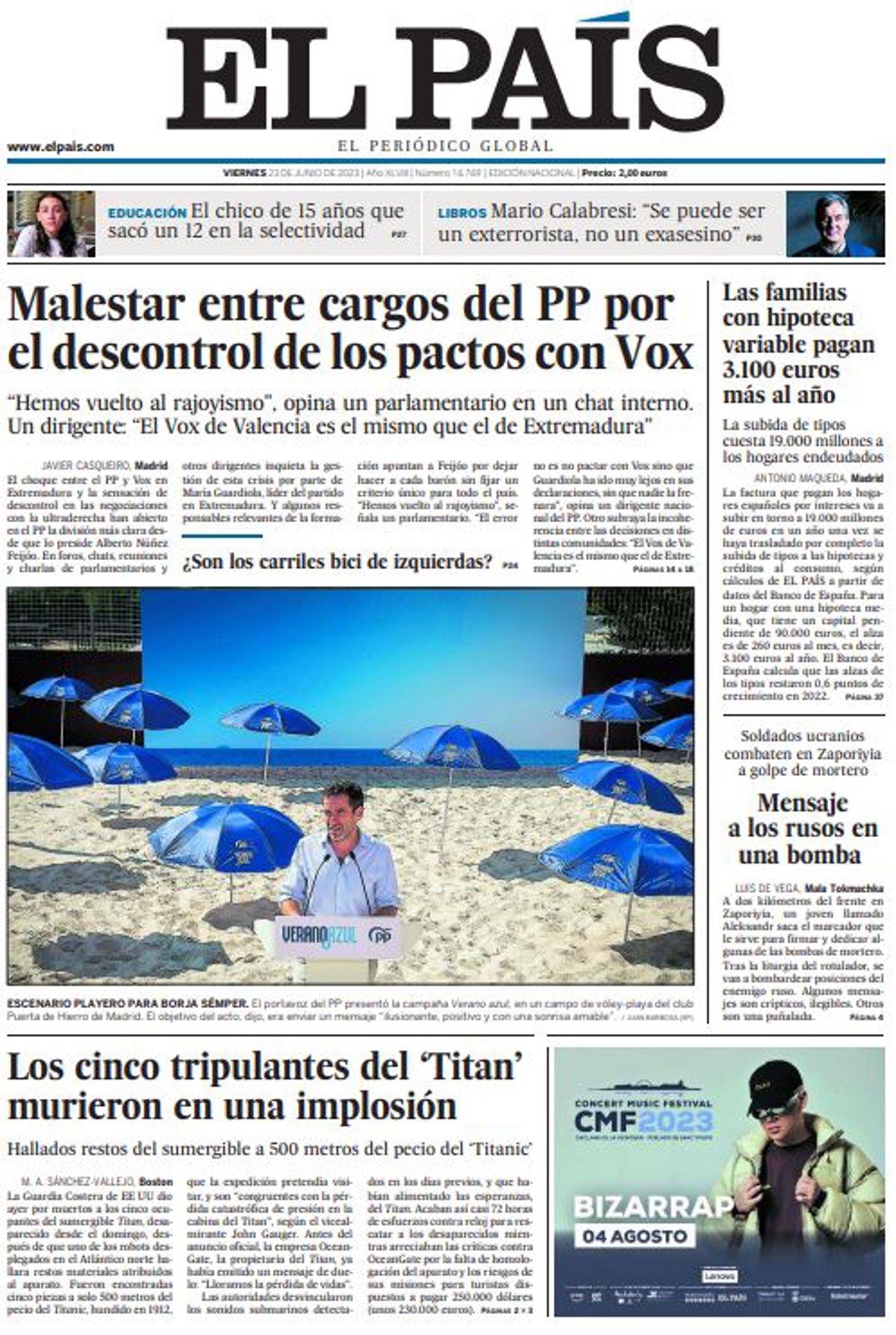 EL PAÍS: "Malestar entre cargos del PP por el descontrol de los pactos con Vox"; "Los cinco tripulantes del 'Titan' murieron en una implosión"; "Las familias con hipoteca variable pagan 3.100 euros más al año"; "Mensaje a los rusos en una bomba".