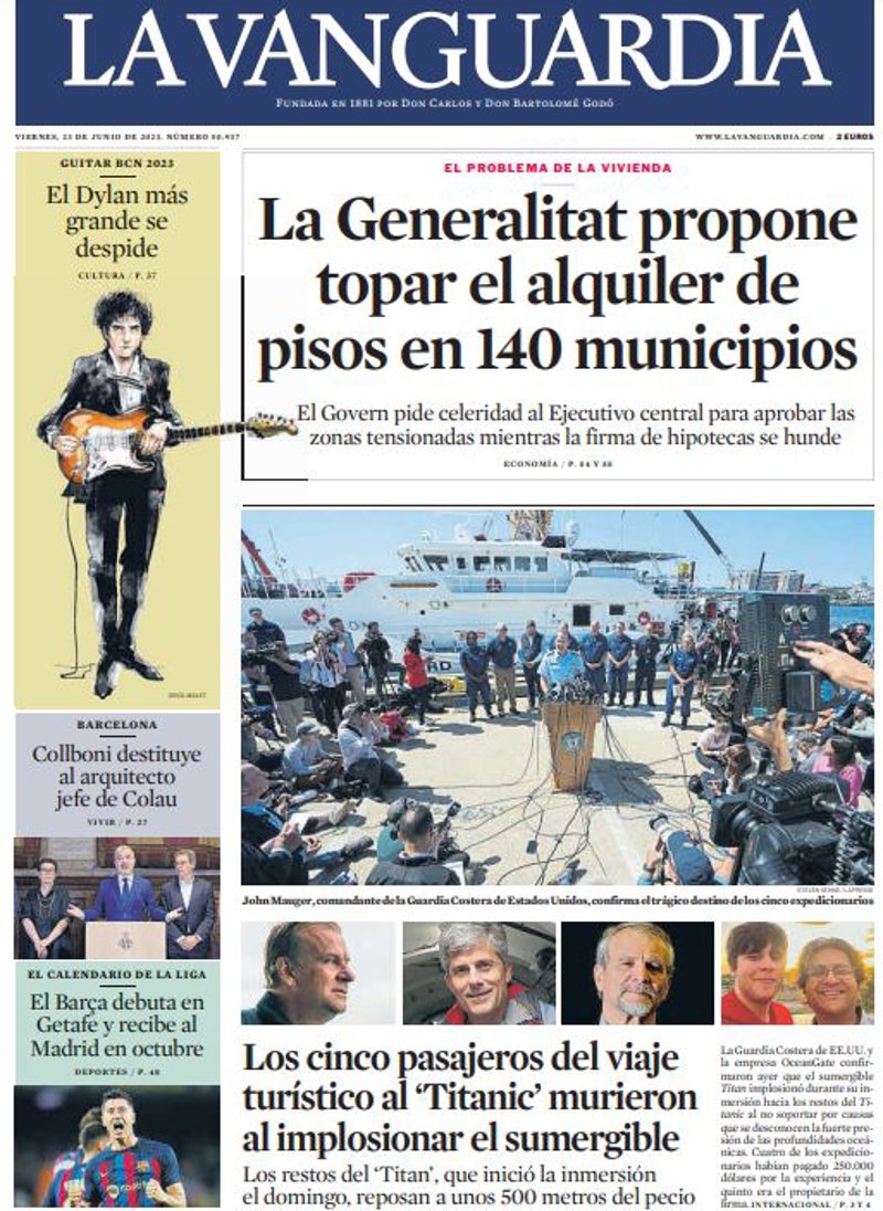 LA VANGUARDIA: "La Generalitat propone topar el alquiler de pisos en 140 municipios"; "Los cinco pasajeros del viaje turístico al 'Titanic' murieron al implosionar el sumergible".