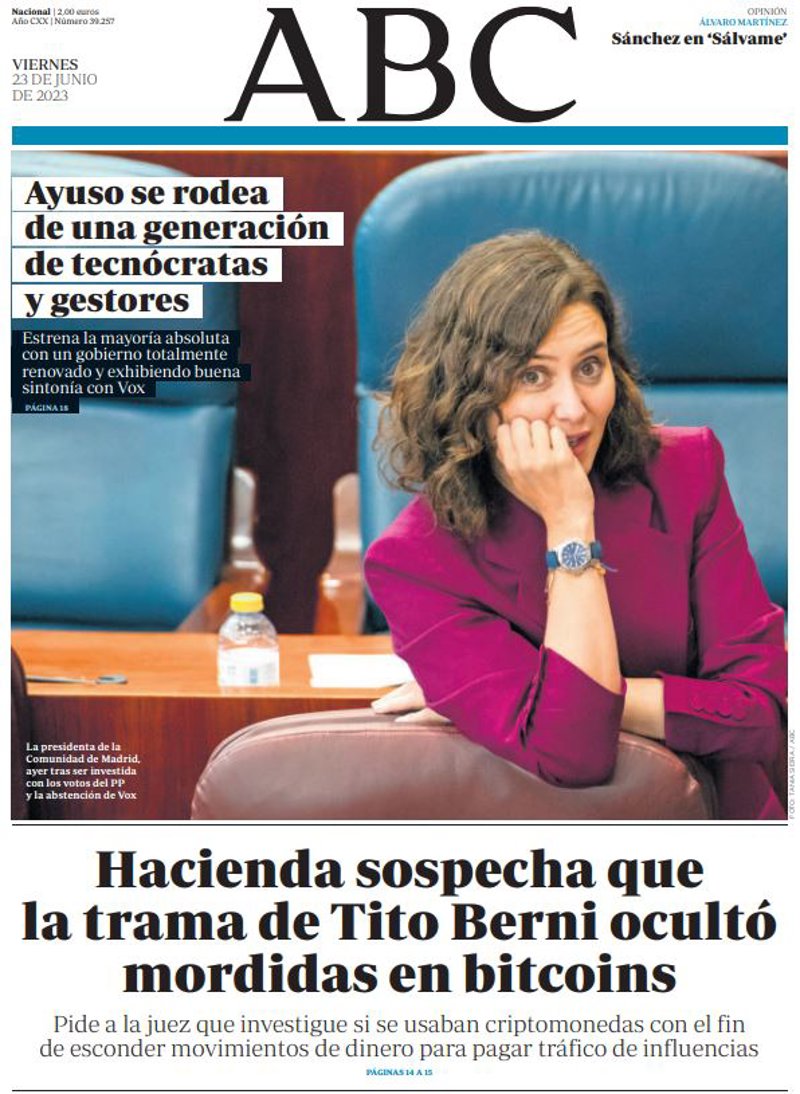 ABC: "Hacienda sospecha que la trama de Tito Berni ocultó mordidas en bitcoins. Pide a la juez que investigue si se usaban criptomonedas con el fin de esconder movimientos de dinero para pagar tráfico de influencias"; "Ayuso se rodea de una generación de tecnócratas y gestores. Estrena la mayoría absoluta con un gobierno totalmente renovado y exhibiendo buena sintonía con Vox".