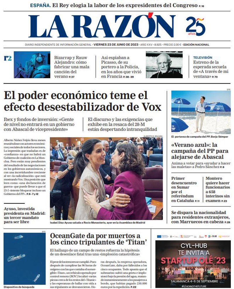 LA RAZÓN: "El poder económico teme el efecto desestabilizador de Vox"; "OceanGate da por muertos a los cinco tripulantes de 'Titan'"; ""Verano azul": la campaña del PP para alejarse de Abascal"; "Primer desencuentro en Sumar por el referéndum en Cataluña"; "Montero quiere hacer funcionarios a 658 interinos sin examen"; "Se dispara la nacionalidad para residentes extranjeros, con Marruecos en cabeza".