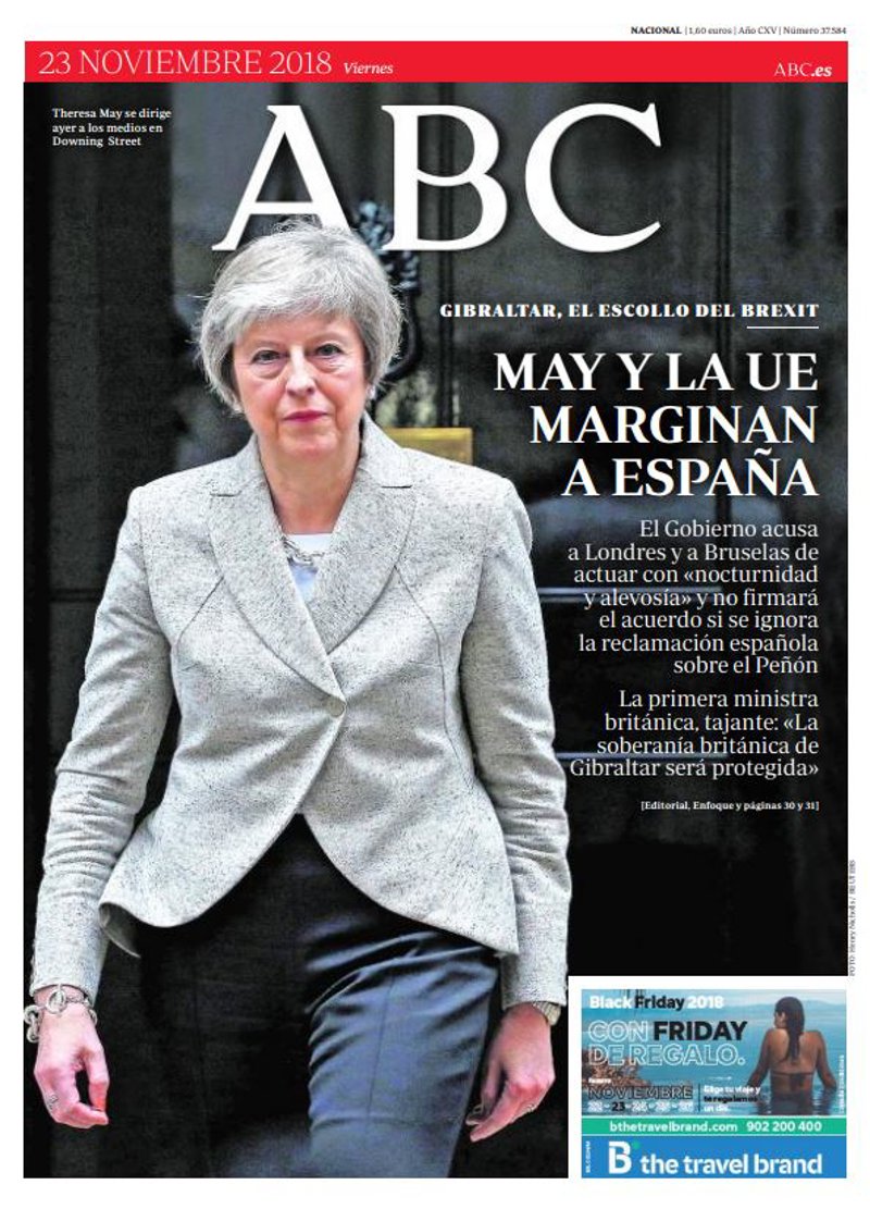 ABC: "May y la UE marginan a España"; "El Gobierno acusa a Londres y a Bruselas de actuar con 'nocturnidad y alevosía' y no firmará el acuerdo si se ignora la reclamación española sobre el Peñón"; "La primera ministra británica, tajante: 'La soberanía británica de Gibraltar será protegida'".