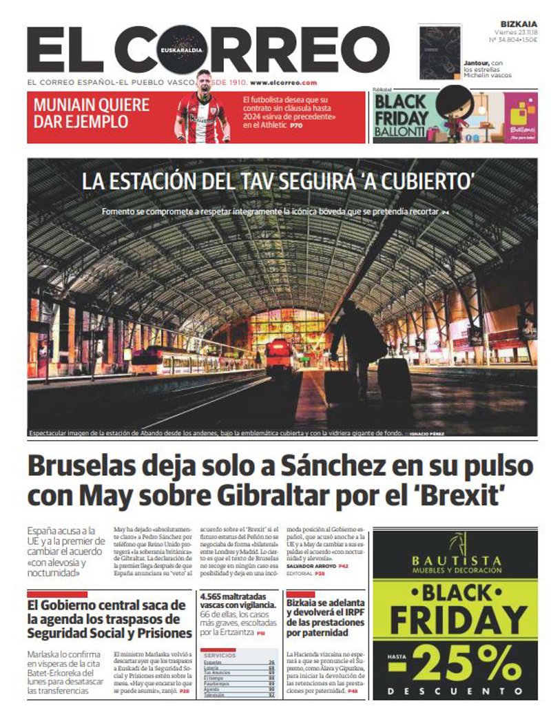 EL CORREO: "Bruselas deja solo a Sánchez en su pulso con May sobre Gibraltar por el 'Brexit'"; "El Gobierno central saca de la agenda los traspasos de Seguridad Social y Prisiones"; "Bizkaia se adelanta y devolverá el IRPF de las prestaciones por paternidad"; "4.565 maltratadas vascas con vigilancia".