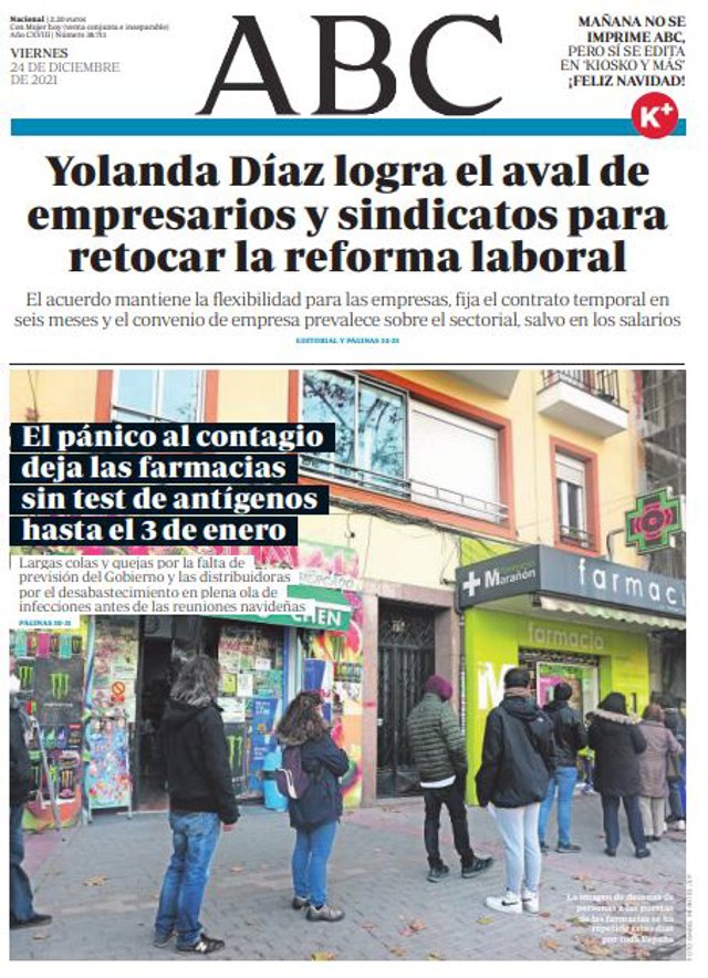 ABC: "Yolanda Díaz logra el aval de empresarios y sindicatos para retocar la reforma laboral"; "El pánico al contagio deja las farmacias sin test de antígenos hasta el 3 de enero".