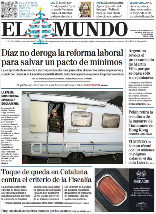 EL MUNDO: "Díaz no deroga la ley reforma laboral para salvar un pacto de mínimos"; "La Palma: Nochebuena sin casa y en caravana"; "Toque de queda en Cataluña contra el criterio de la Fiscalía"; "Argentina revoca el procesamiento de Martín Villa porque se basa solo 'en opiniones'"; "Pekín retira la escultura de la masacre de Tiananmen en Hong Kong".