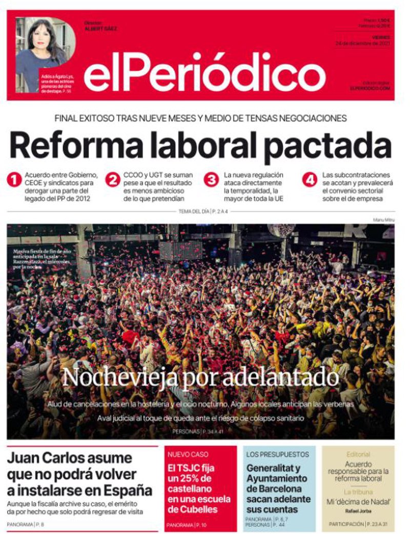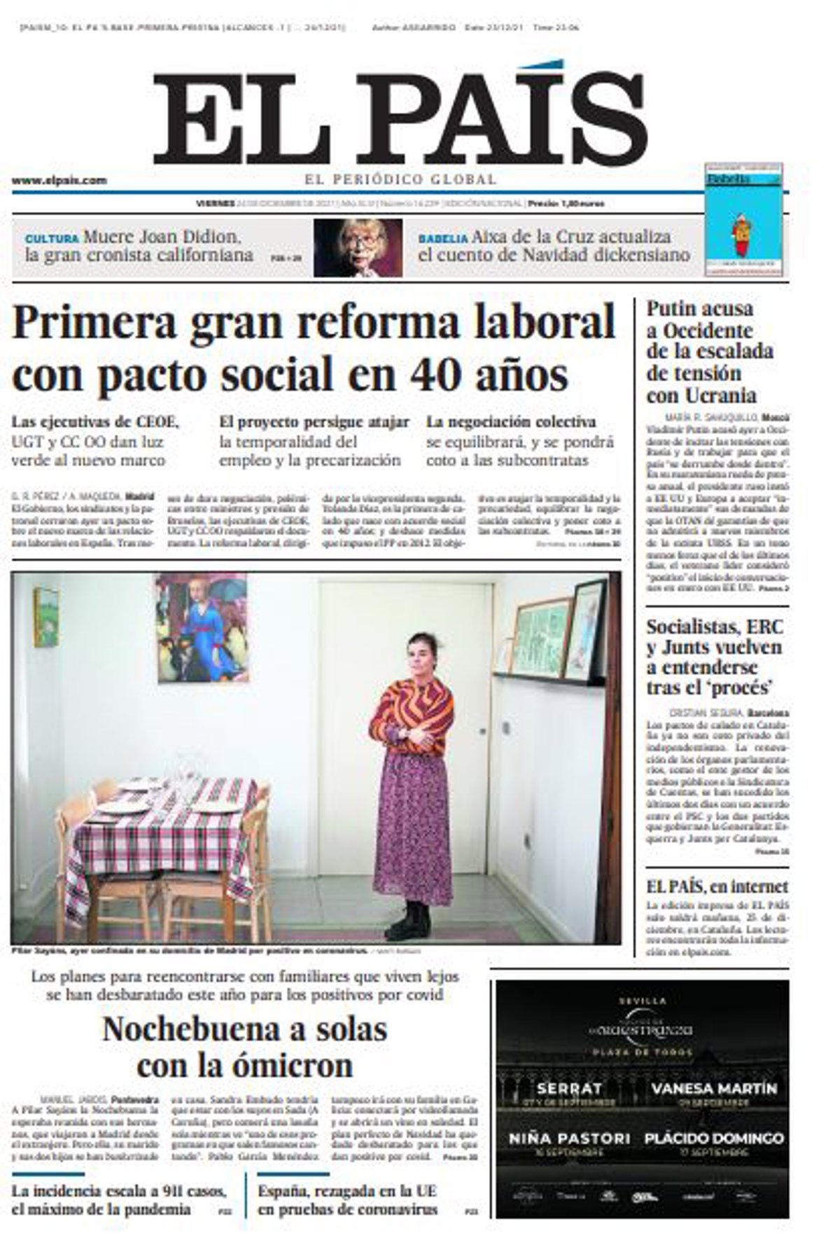 EL PAÍS: "Primera gran reforma laboral con pacto social en 40 años"; "Nochebuena a solas con la ómicron"; "Putin acusa a Occidente de la escalada de tensión con Ucrania"; "Socialistas, ERC y Junts vuelven a entenderse tras el 'procés'".