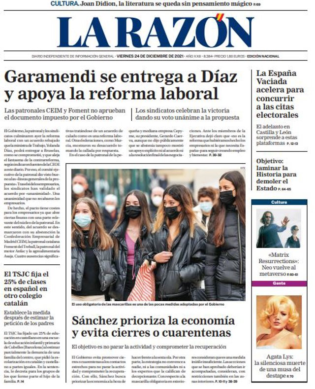 LA RAZÓN: "Garamendi se entrega a Díaz y apoya la reforma laboral"; "Sánchez prioriza la economía y evita cierres o cuarentena"; "La España Vaciada acelera para concurrir a las citas electorales"; "El TSJC fija el 25% de clases en español en otro colegio catalán"; "Objetivo: laminar la Historia para demoler el Estado".