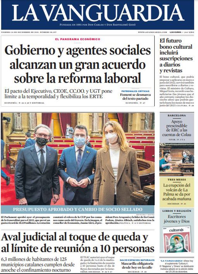LA VANGUARDIA: "Gobierno y agentes sociales alcanzan un gran acuerdo sobre la reforma laboral"; "Aval judicial al toque de queda y al límite de reunión a 10 personas"; "El futuro bono cultural incluirá suscripciones a diarios y revistas".