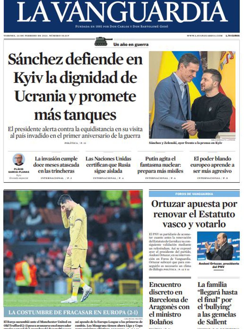 LA VANGUARDIA: "Sánchez defiende en Kyiv la dignidad de Ucrania y promete más tanques"; "Ortuzar apuesta por renovar el Estatuto vasco y votarlo"; "Encuentro discreto en Barcelona de Aragonès con el ministro Bolaños"; "La familia "llegará hasta el final" por el 'bullying' a las gemelas de Sallent".