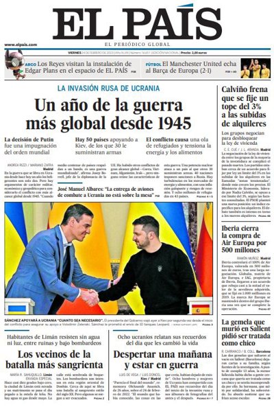 EL PAÍS: "Un año de la guerra más global desde 1945"; "Los vecinos de la batalla más sangrienta"; "Despertar una mañana y estar en guerra"; "Calviño frena que se fije un tope del 3% a las subidas de alquileres"; "Iberia cierra la compra de Air Europa por 500 millones"; "La gemela que murió en Sallent pidió ser tratada como chico".