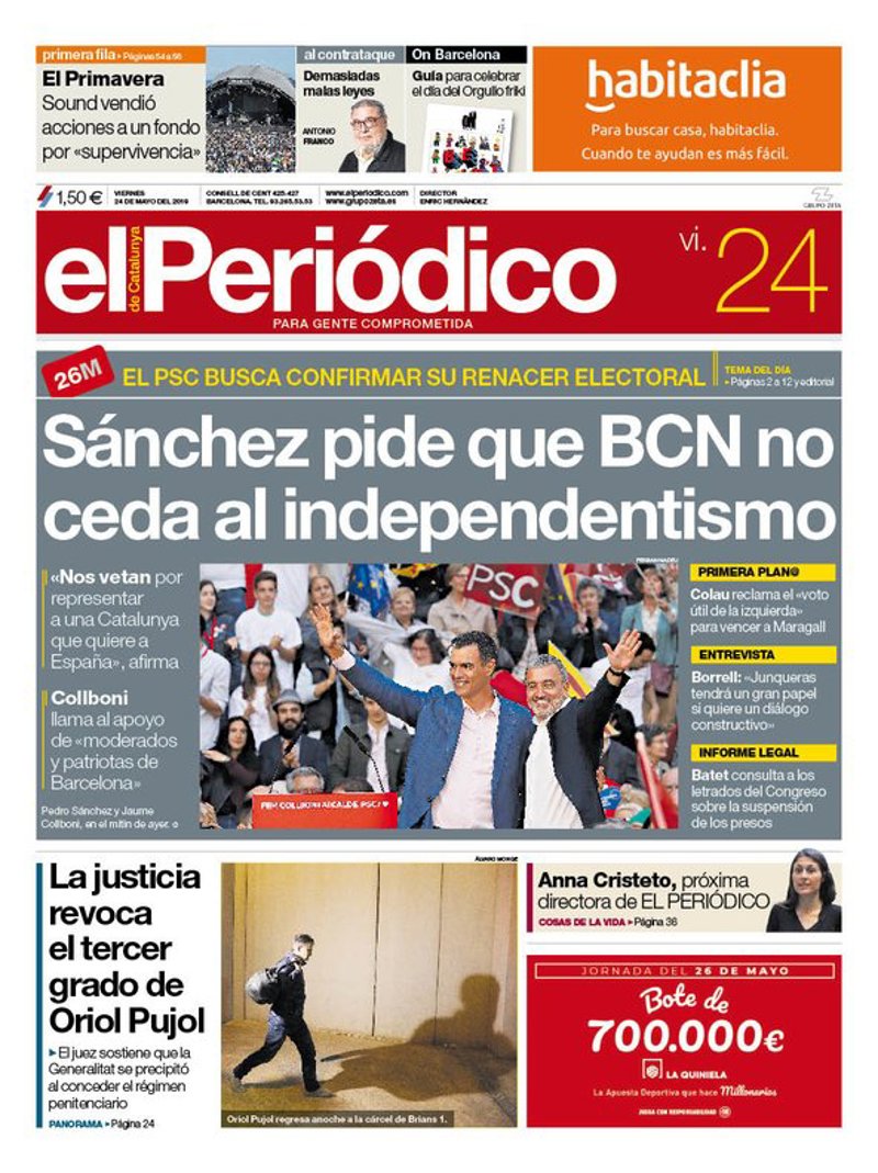 EL PERIÓDICO: "Sánchez pide que BCN no ceda al independentismo"; "El PSC busca confirmar su renacer electoral"; "La justicia revoca el tercer grado de Oriol Pujol"; "Anna Cristeto, próxima directora de El Periódico"; "El Primavera Sound vendió acciones a un fondo por 'supervivencia'".
