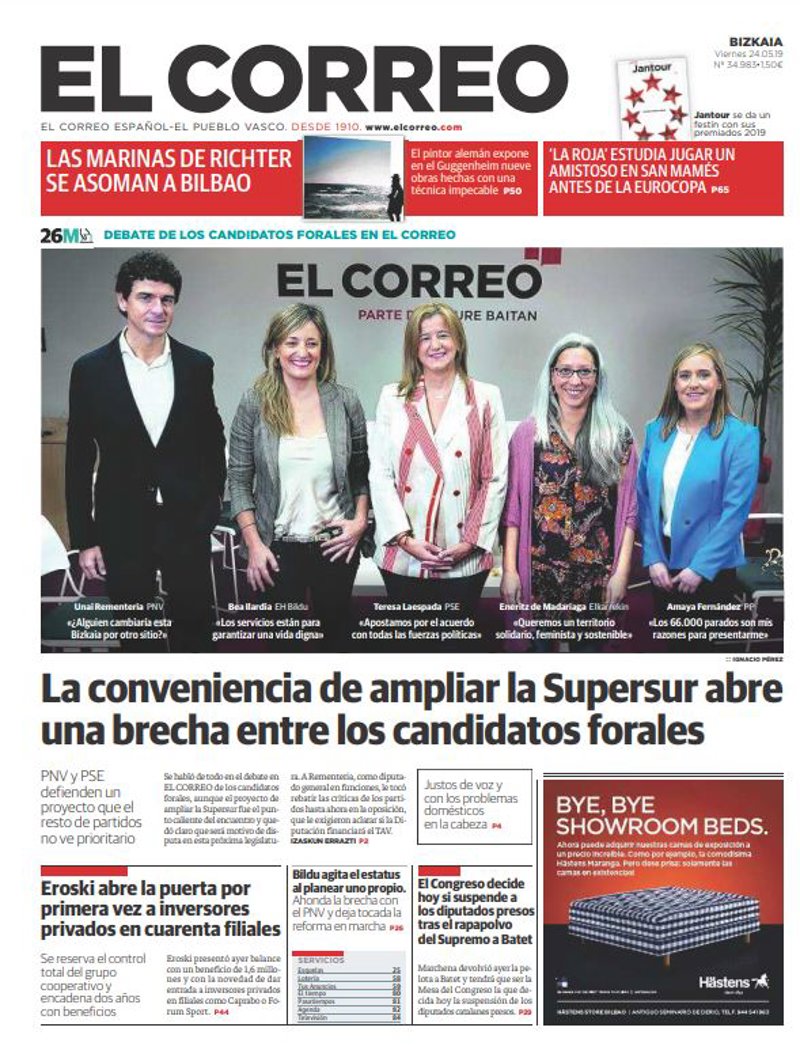 EL CORREO: "La conveniencia de ampliar la Supersur abre una brecha entre los candidatos forales"; "Eroski abre la puerta por primera vez a inversores privados en cuarenta filiales"; "El Congreso decide hoy si suspende a los diputados presos tras el rapapolvo del Supremo a Batet".