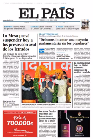 EL PAÍS: "La Mesa prevé suspender hoy a los presos con aval de los letrados"; Frans Timmermans, candidato socialista a presidente de la Comisión Europea: "Debemos intentar una mayoría parlamentaria sin los populares"; "La multinacional líder en diálisis sobornó a médicos de la sanidad española".