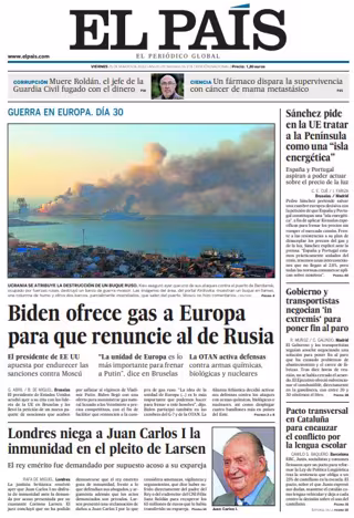 EL PAÍS: "Biden ofrece gas a Europa para que renuncie al de Rusia"; "Londres niega a Juan Carlos I la inmunidad en el pleito de Larsen"; "Sánchez pide en la UE tratar a la Península como una "isla energética"; "Gobierno y transportistas negocian 'in extremis' para poner fin al paro"; "Pacto transversal en Cataluña para encauzar